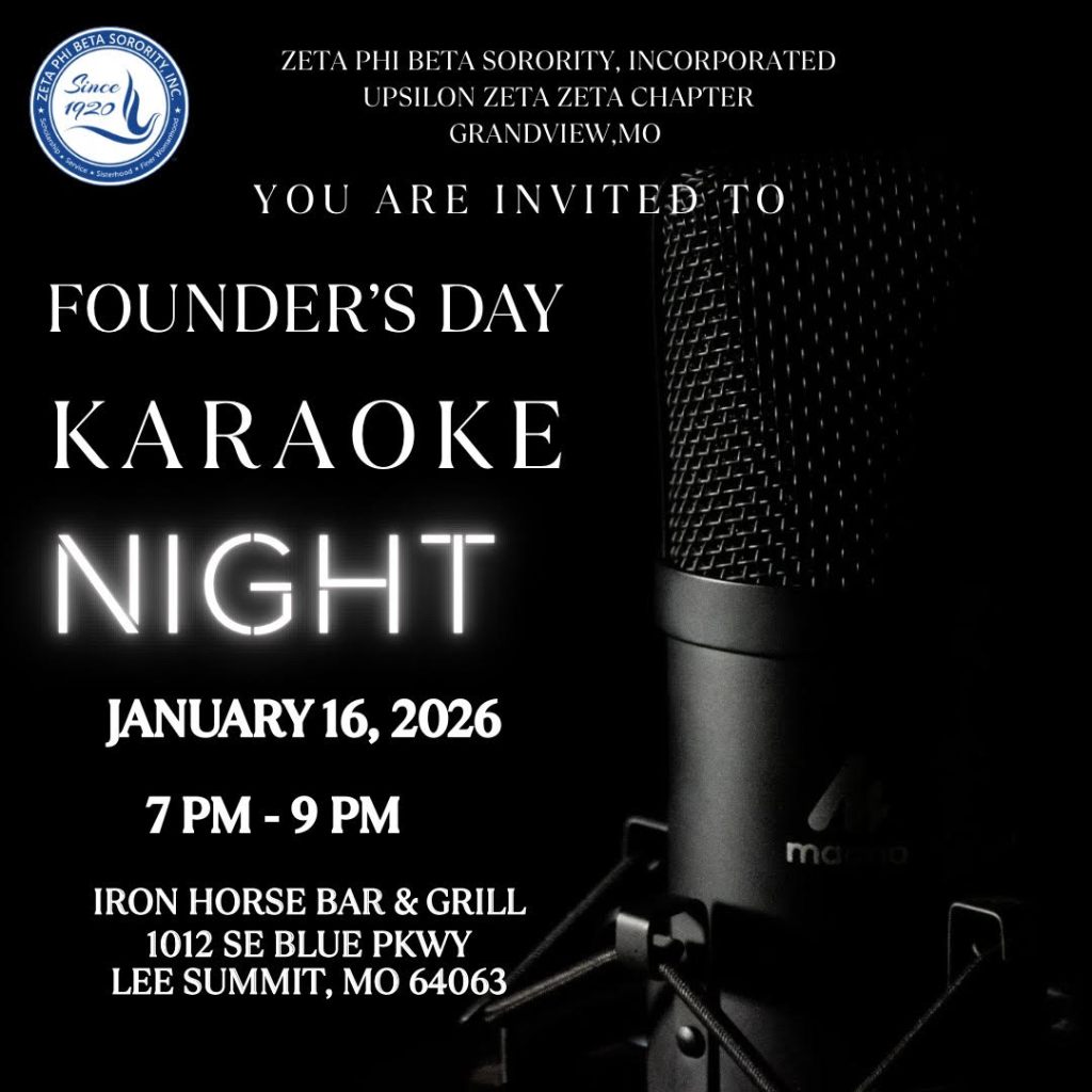 You are formally invited to the Upsilon Zeta Zeta Chapter of Grandview, MO’s Founders Day Karaoke Night, taking place on January 16, 2026, from 7-9 pm. 🎤🎤