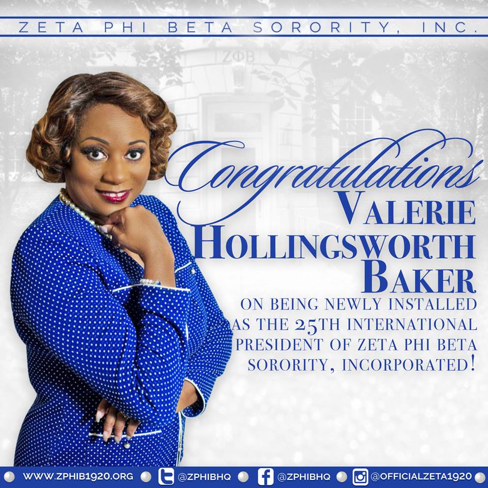 We are proud to announce that Soror Valerie Hollingsworth-Baker, our immediate past International First Vice President, is now the International President of Zeta Phi Beta Sorority, Incorporated.